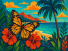Ein leuchtender Schmetterling schwebt über tropischen Blüten am Meer – dieses farbenfrohe Motiv fängt das Gefühl von Sonne, Freiheit und sommerlicher Leichtigkeit ein.