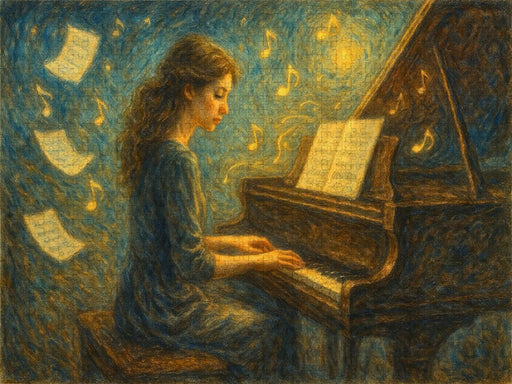 Eine Frau versunken im Klang des Klaviers In sanftes Licht getaucht, spielt eine Frau am Klavier – ein Moment voller Anmut, Ruhe und Klanggefühl. ...