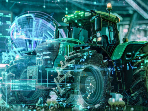 Erleben Sie die Zukunft der Landwirtschaft mit diesem High-Tech-Landmaschinen-Bild. Traktoren und Mähdrescher in Aktion bei vielfältigen Aufgaben ...