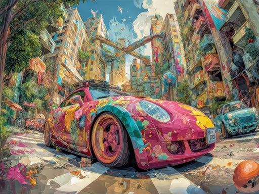 Ein originelles Auto Ob Radfahrer, stolze Hunde oder ein buntes Auto in der Stadt - diese KI-generierten Werke zeigen eine turbulente Welt voller ...