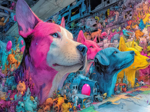 Als die Hunde träumten Ob Radfahrer, stolze Hunde oder ein buntes Auto in der Stadt, diese KI-generierten Werke zeigen eine turbulente Welt voller...