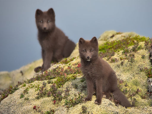 junge Polarfüchse in Island Ein seltener Blick auf das verspielte Leben junger Polarfüchse in freier Wildbahn. Umgeben von Islands bizarrer Lavala...