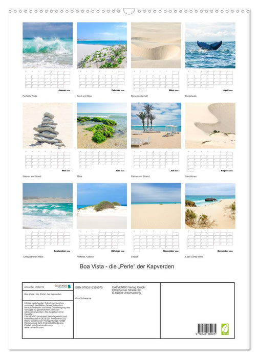 Boa Vista ist eine der kapverdischen Inseln vor der Küste Westafrikas. Sie ist für Sanddünen, menschenleeren Strände und dem türkisfarbenen Meer bekannt. Buckelwale ziehen auf ihrer Wanderung an der Küste vorbei. Lassen Sie den Alltag hinter sich, denn dieser Kalender macht Lust auf den nächsten Urlaub.