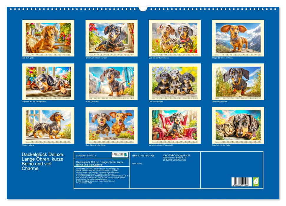 Dieser Kalender zeigt den einzigartigen Charme der beliebten Hunderasse in heiteren Illustrationen. Ob verspielt, neugierig oder gemütlich – jede Szene fängt das Wesen des Dackels auf liebevolle Weise ein. Alle Bilder wurden mit der Hilfe von KI erstellt und sorgen Monat für Monat für gute Laune und ein Lächeln im Gesicht. Ideal für Hundefreunde, Dackelbesitzer und alle, die das Besondere lieben.