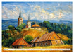 Juni: Kleines Dorf mit Kirche auf einem Hügel