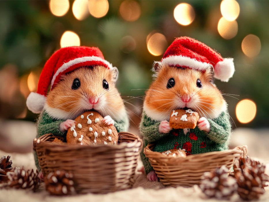Zwei flauschige Weihnachtswunder im Kekshimmel. In ihren festlichen Strickpullis und mit kleinen roten Weihnachtsmützen auf den Köpfchen naschen sie sich durchs Fest. Im Hintergrund glitzert der Tannenbaum, es duftet förmlich nach Zimt und Liebe, und man hört fast das Rascheln von Geschenkpapier. Wer braucht schon Rentiere, wenn man solch knusprige Keksfreude im Doppelpack hat? Die Szene wurde liebevoll und fantasievoll mit Unterstützung künstlicher Intelligenz erschaffen.