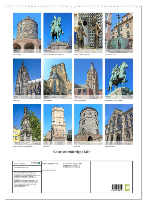 Der Kalender nimmt Sie mit auf einen Rundgang durch die Hansestadt Köln und zeigt Ihnen eine Auswahl der schönsten und prachtvollsten historischen Bauten Kölns. Eine Zeitreise von beeindruckenden Festungsanlagen, über historische Persönlichkeiten hinzu eindrucksvollen Gotteshäusern.