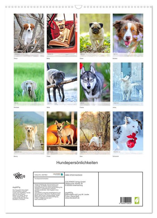 Dieser Fotokalender von dogARTig für alle, die Hunde lieben, enthält fröhliche, farbenfrohe Porträts verschiedener Hunderassen vom Chihuahua über den Jack Russell Terrier bis zum Weimaraner. Die Fotos zeigen perfekt die einzigartige Persönlichkeit jedes einzelnen Hundes.