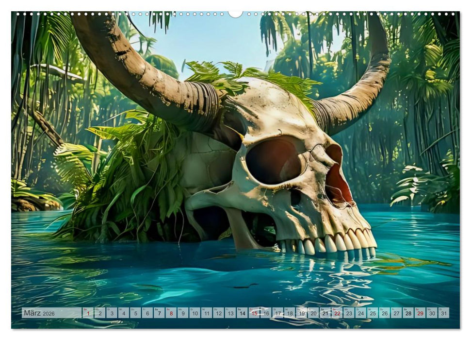 Ein mystischer KI Fantasy-Kalender, der zwölf unheimliche Szenen uralter, gigantischer Überreste zeigt – von versteinerten Fußspuren über gewaltige Knochenbrücken bis zu versunkenen Dolchen in vergessenen Gebirgen – als stille Zeugnisse einer ausgestorbenen Herrscherrasse.