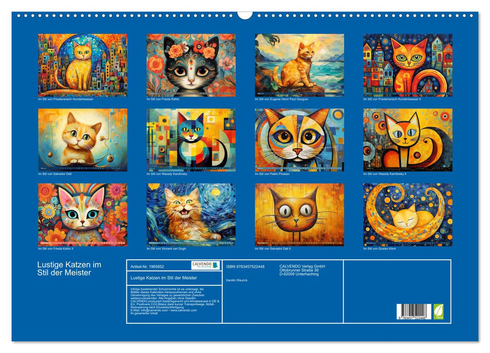 Was wäre, wenn bekannte moderne Künstler Katzen gemalt hätten? Und sich nicht allzu ernst dabei genommen hätten? Vielleicht wären dabei die Bilder dieses Kalenders entstanden. Fröhliche, witzige, absurde und kunterbunte Katzenbilder für ein ganzes Jahr. Die Bilder dieses Kalenders wurden erstellt mit Fantasie, Kreativität, künstlicher Intelligenz und Photoshop.