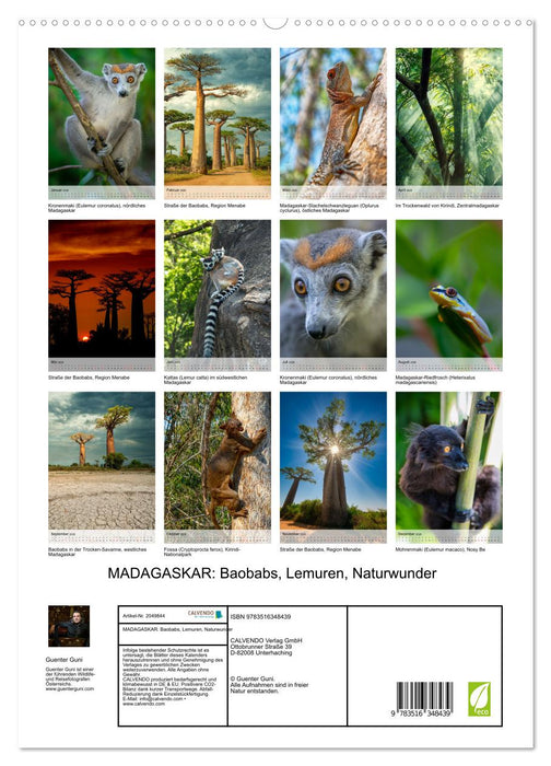 Dieser Kalender des österreichischen Fotografen führt nach Madagaskar, der viertgrößten Insel der Erde. Madagaskar ist eine Welt für sich. Einzigartig ist die Vielfalt an unterschiedlichen Landschaftsformen auf engstem Raum: tropischer Regen‐ und Nebelwald, Trockenwald, Dornbuschsavanne, hohe Felsberge und Traumstrände am Indischen Ozean. Neben diesen landschaftlichen Höhepunkten beeindruckt