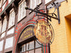 Historisches Fachwerkaus mit einem verzierten Ausleger-Schild. Das Schild wirbt für die "Rats Apotheke" und das Geschäft von J. Thörmer für Korb- und Spielwaren. Die Jahreszahl 1689 ist zu sehen.