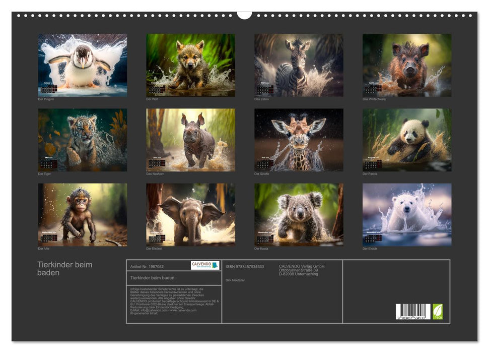Es gibt kaum etwas Niedlicheres und schöneres als junge Tiere zu beobachten und wenn sie dann noch im Wasser planschen ist das besonders drollig. Der Fotograf Dirk Meutzner hat in diesem Kalender zwölf wunderschön einzigartige Bilder für Sie zusammengestellt, es wird Sie begeistern. Produziert wurden diese Bilder mit KI und Photoshop.