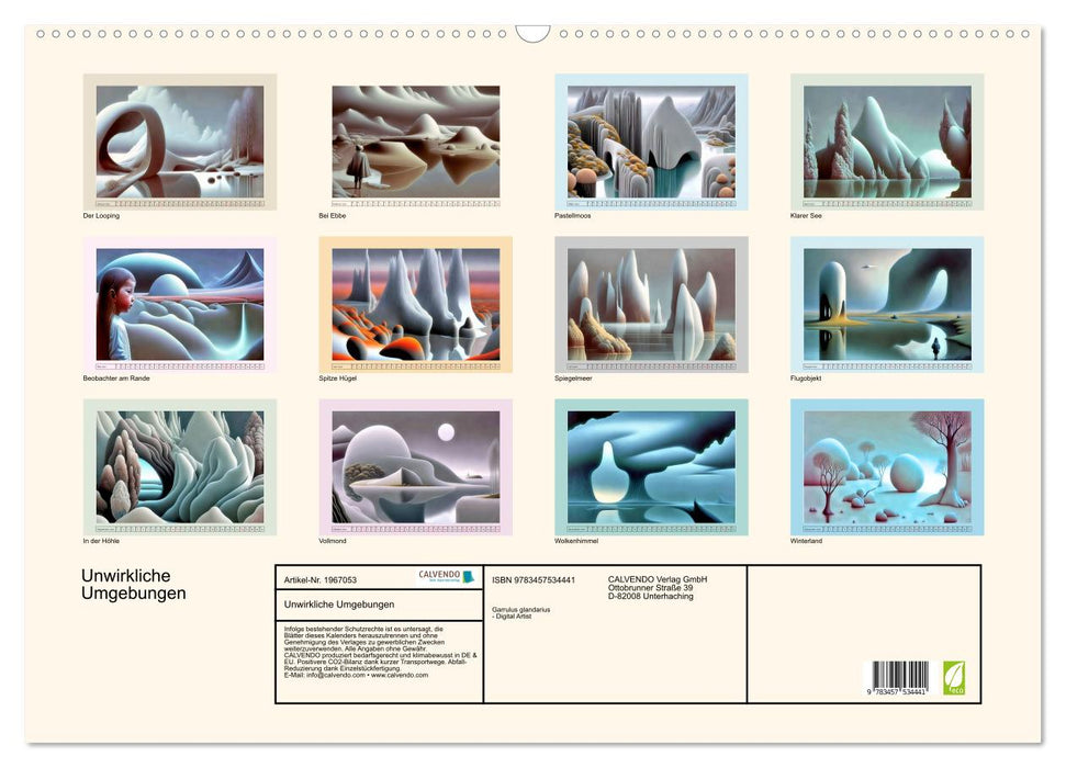 Erleben Sie faszinierende surreale Landschaften, die Sie in ihren Bann ziehen werden. Diese zwölf Fantasiewelten verzaubern mit harmonischen Farben und entführen Sie in eine Welt voller Geheimnisse. Entdecken Sie neue Dimensionen und lassen Sie Ihrer Fantasie freien Lauf - ein unvergessliches Erlebnis für Träumer und Freigeister.
