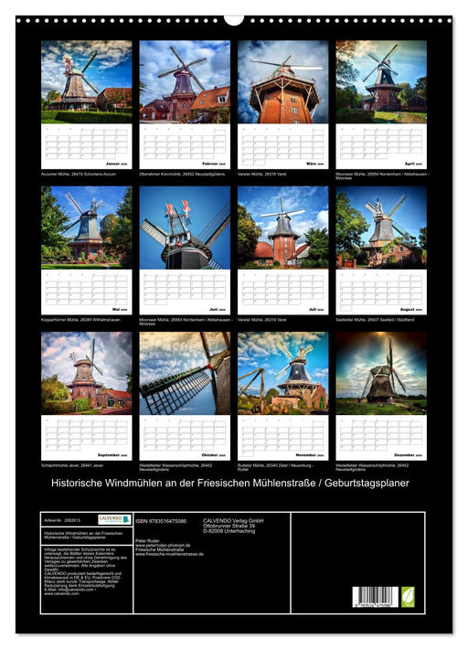 Afficher tous les détailsHistorische Windmühlen an der Friesischen Mühlenstraße / Geburtstagsplaner (CALVENDO Premium Wandkalender 2026)