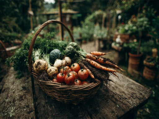 Ein voller Korb mit frisch geerntetem Gemüse zeigt die Schönheit der Natur und erinnert an gesunde Ernährung und die Freude am eigenen Garten. Die...