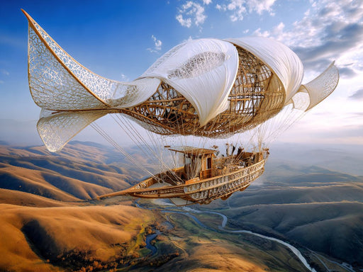 Großsegler des Himmels mit filigranem Aufbau Ein majestätisches Luftschiff mit gewaltigen, stoffbespannten Tragflächen symbolisiert die Harmonie v...
