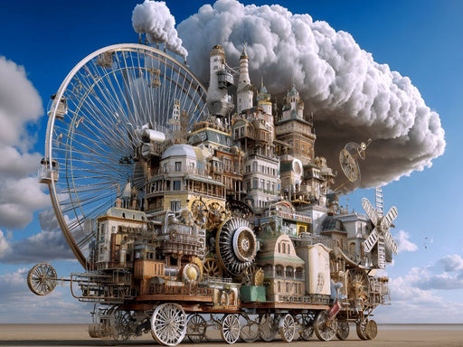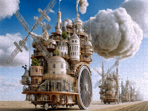 Windgetriebene Stadtmaschine auf großer Fahrt Eine phantastische Himmelsstadt auf mächtigen Rädern, die sanft über das Wolkenmeer rollt – angetrie...