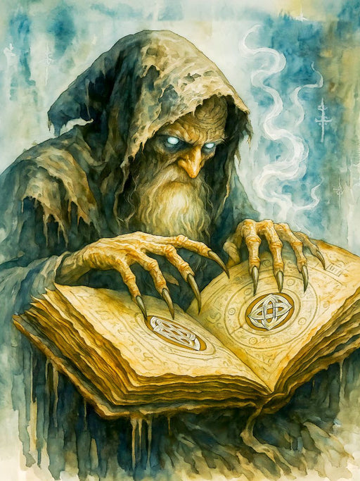 Druidenmagier mit Klauenhand, Symbolen und Nebelmagie Ein uralter Druide mit finsterem Blick liest aus einem Buch voller Symbole, seine Klauenhand...