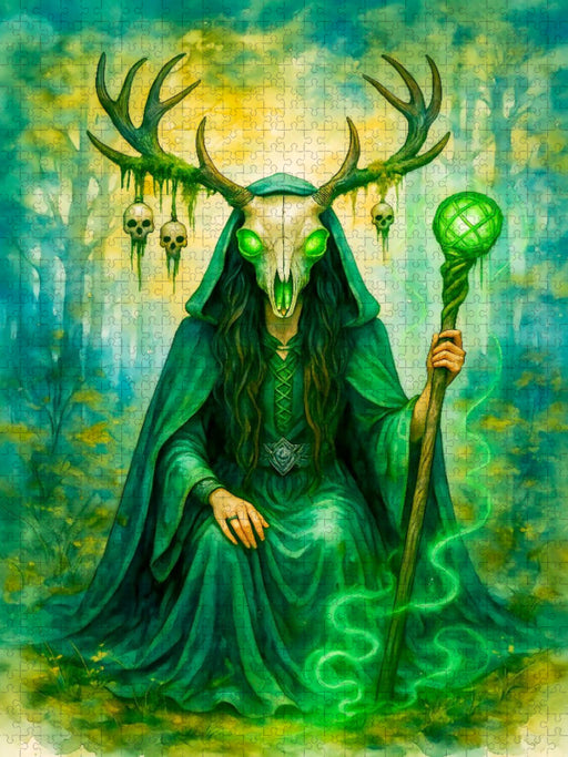 Druidenpriesterin mit Schädelmaske, Stab und Grünmagie Diese kraftvolle Druidin mit Geweihmaske und grün leuchtendem Zauberstab strahlt urtümliche...
