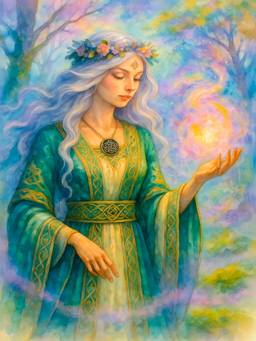 Druidenmagie mit Symbolen, Farben und Lichtspirale Eine Druidin mit offenem Haar beschwört eine schwebende Lichtkugel, umgeben von Farben und Symb...