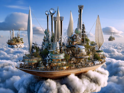 Schwebende Stadtsegler mit Windkraft und Gärten Diese faszinierende Luftstadt vereint modernste Windtechnik mit grüner Architektur – eine schweben...