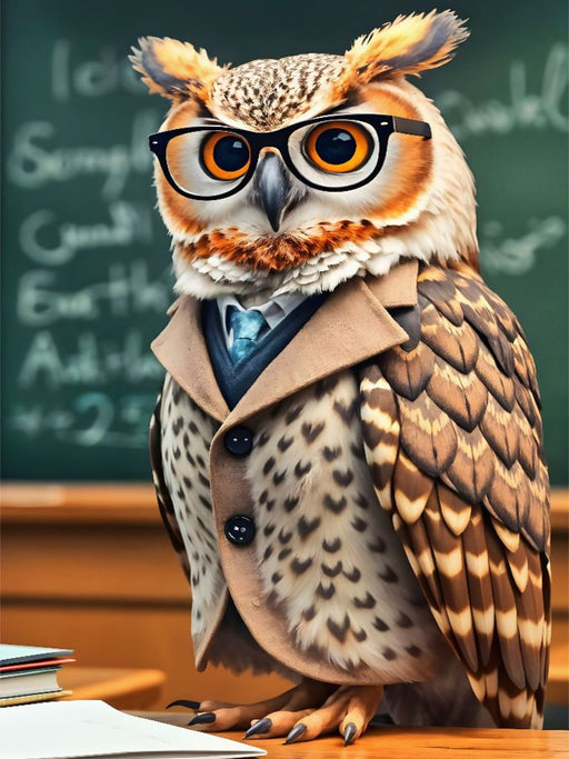 Mit Brille auf dem Schnabel und Kreide in der Kralle erklärt diese Eule die Welt! Das KI-generierte Motiv zeigt eine lehrende Eule in klassischem ...