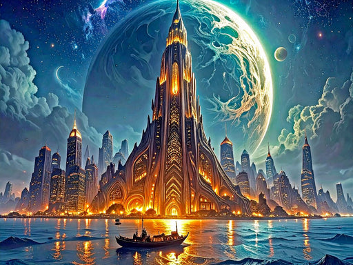 Irdische Architektur auf fernen Welten Dieses Bild entführt Sie auf einen fremden Planeten, wo monumentale, KI-generierte Bauwerke unter einem rie...