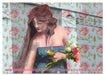 Juni: Historische Statue mit Blumen auf dem Arm, Friedhof Wilmersdorf, Berlin, künstlerisch coloriert
