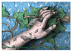 Mai: Hand einer Statue mit Vogeldesign, Friedhöfe am Mehringdamm, Berlin, künstlerisch coloriert