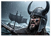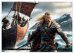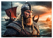 April: Stolzer Wikinger vor Drachenbooten im Abendrot