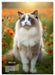 März: Ragdoll sitzt im Feld zwischen orangefarbenen zarten Blüten