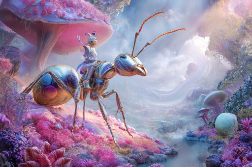Ritt auf einer Riesenameise Gezeigt werden KI-generierte Bilder von Planeten, die von biomechanischen und aus der Fantasie entsprungenen Insekten ...