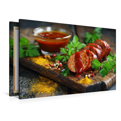 Afficher tous les détailsPremium Textil-Leinwand Currywurst mit Sauce und Gewürzen