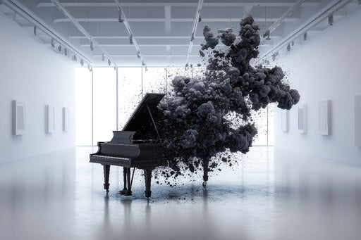 Minimalistische Kunst mit Flügel und abstrakter Transformation Dieses faszinierende Motiv zeigt einen schwarzen Konzertflügel, der sich in einem l...