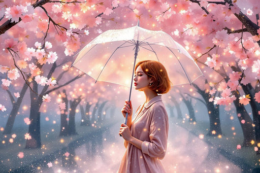 Eine Frau mit Regenschirm Dieses eindrucksvolle Kunstwerk zeigt eine junge Frau mit kupferfarbenen, kurzen Haaren, die mit einem transparenten Sch...