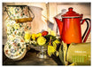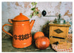Emaille ist wieder groß im Kommen. Hier werden alte Kannen in fröhlich farbigem und nostalgischem Umfeld präsentiert. Für Kaffee- und Vintage-Liebhaber. Ein Gute-Laune-Macher für Küche oder Essecke.