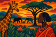 Dieses kunstvolle Motiv zeigt den Zauber Afrikas in seiner ganzen Harmonie. Eine afrikanische Frau trägt ihre Schale auf dem Kopf, während ein Zebra neugierig innehält – eingerahmt von Akazien, Bergen und dem sanften Schein der Abendsonne. Die leuchtenden Farben von Orange, Blau und Grün fangen das Gefühl von Leben, Wärme und Ruhe ein. Ein Bild, das stolz, Schönheit und Gelassenheit vereint – perfekt für alle, die die Magie Afrikas lieben.