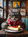 Ein stilbewusster Kater beim entspannten Kaffeepausen-Moment: Mit rot-weißem Schal, runder Brille und einem klugen Blick sitzt diese charmante Samtpfote in einem hippen Retro-Café und genießt ein großes Stück cremigen Käsekuchen mit leuchtend roten Kirschen. Die Backsteinwand mit Katzenkunst und das urbane Fensterlicht machen diese Szene zur perfekten Mischung aus Großstadtflair und Katzenhumor. Dieses Motiv bringt Café-Atmosphäre und augenzwinkernden Stil an jede Wand – ein originelles Geschenk für Katzenliebhaber, Foodies und Fans von tierischer Kunst mit Persönlichkeit.