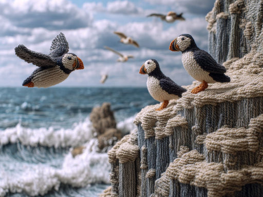 Textile Naturwelten Steile Klippen und Papageientaucher erscheinen hier als textile Landschaftskomposition. Die KI-Generierung verleiht Felsen, Me...