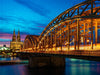 Die Hohenzollernbrücke ist eine der wichtigsten Eisenbahnbrücken in Deutschland und eines der Wahrzeichen Kölns. Mit ihrer Beleuchtung am Abend und dem Kölner Dom im Hintergrund gehört sie zu den bekanntesten Fotomotiven in der Stadt. Mit drei ikonischen Wellenbögen und einer Länge von über 400 Metern spannt sie sich als mächtige Stahlkonstruktion kraftvoll über den Rhein und prägt so neben Dom und Rhein das Stadtbild von Köln. Von der Uferseite des Stadtteils Deutz aus genießt man einen phantastischen Panoramablick auf die Innenstadt, und wenn man die Brücke überquert, wird man einmal mehr durch unzählige an den Geländern befestigte Liebesschlösser beeindruckt, für die die Hohenzollernbrücke mittlerweile ebenfalls berühmt ist.