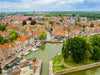 Ein Luftbild von Hoorn in Nordholland zeigt den historischen Hafen mit seinen alten Schiffen und die charmante Altstadt mit verwinkelten Gassen und markanten Gebäuden – ein maritimes Juwel am IJsselmeer.