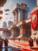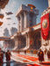 Ein futuristischer römischer Raumhafen erhebt sich in monumentaler Stein- und Messingarchitektur, durchzogen von imperialem Glanz und klassischer Symmetrie. Römische Legionäre in roten Tuniken und glänzender Lorica Segmentata patrouillieren zwischen wehenden SPQR-Bannern mit Adleremblemen, während ein gewaltiges Raumschiff unter den Blicken der Soldaten auf einer verzierten Landeplattform einschwebt. Digitale Mosaike an den Wänden erzählen in animierter Form die Feldzüge Caesars, während am Himmel eine gewaltige Mondstation über dem Geschehen wacht.