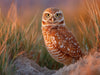 Höhlenkauz sitzt im hohen Gras und blickt neugierig in die Kamera. Wildtier, Vogelmotiv und Naturstimmung – detailreich und stimmungsvoll.