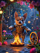 Das Märchen von Rumpelstilzchen erscheint hier in neuer Form. Ein kleiner Hund übernimmt die Rolle der geheimnisvollen Figur, während Feuer und Gold die Szene bestimmen. Eine ungewöhnliche, märchenhafte Darstellung voller Fantasie.
