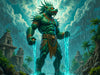 Tlaloc erscheint als furchterregender Gott mit großen, runden Augen und einer Reißzahn-Maske, die an eine amphibische Kreatur erinnert. Aus seinem offenen Mund strömen Wassermassen und Blitze, während er inmitten von Sturmwolken über ein üppig grünes, von Regen überflutetes aztekisches Land herrscht. Seine Hände halten Krüge, aus denen Wasserfälle herabstürzen, und um ihn kreisen Frösche, Schlangen und Wolkensymbole.
