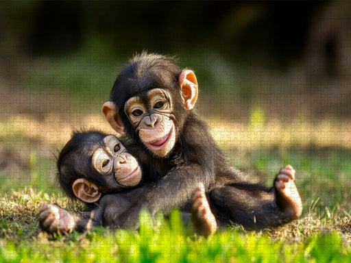 Schimpansen Kinder beim Spielen Zwei Schimpansenkinder spielen auf der Wiese. Wenn es eine olympische Disziplin im „Herz-Erwärmen“ gäbe, diese bei...