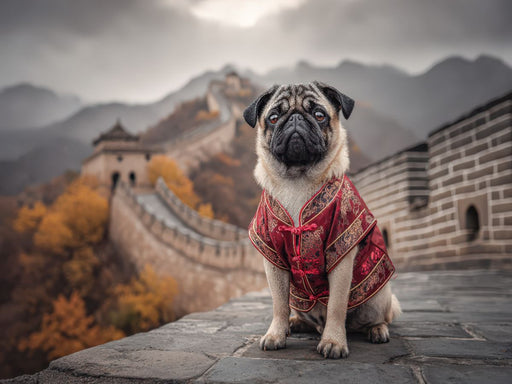 Auf der Mauer, auf der Lauer… In einem traditionellen Gewand vor der Chinesischen Mauer verkörpert dieser Mops zeitlose Eleganz und Stärke. Seine ...