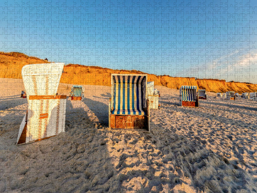 Die Strandkörbe am Strand vom Roten Kliff auf Sylt im goldenen Licht eingefangen. Dieses Stilleben ist einzigartig vom goldenen Lichtschein erhel...
