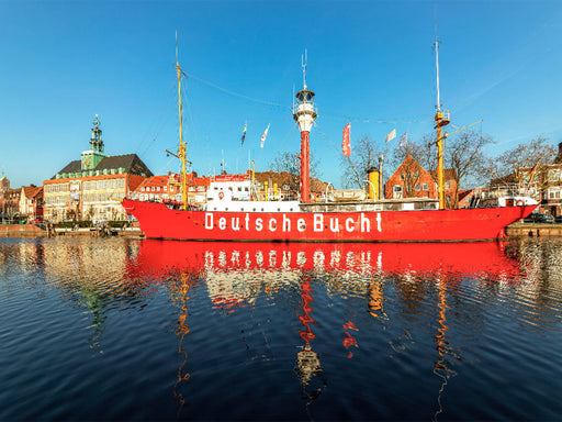 Dieses Feuerschiff im Emder Delft wundervoll in Scene gesetzt. Der blaue Himmel und das blaue Wasser umrahmen das rote Schiff. Ein "Must have" fü...